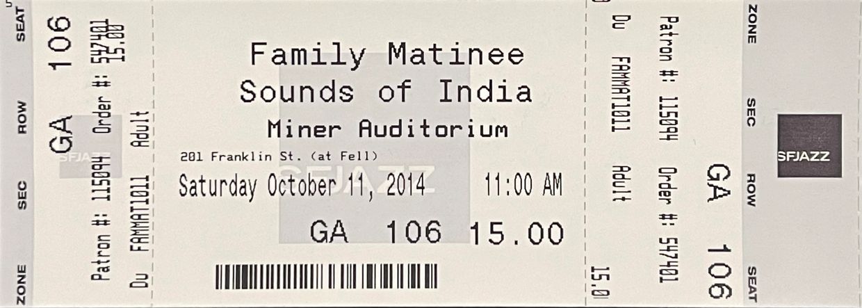 1001. Family Matinee Sounds of India with Zakir Hussain (tabla), Kumaresh Rajagopalan (carnatic violin), and Jayanthi Kumaresh (veena) at the Miner Auditorium in San Francisco, California on Saturday, October 11, 2014 at 11:00 A.M. for $15.00