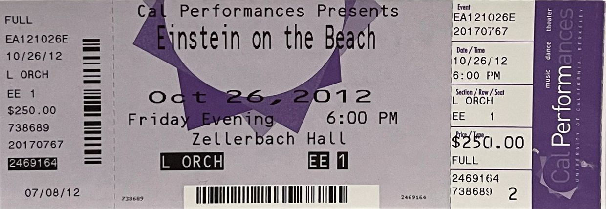 901. Einstein on the Beach performed by the Philip Glass Ensemble at Zellerbach Hall in Berkeley, California on Friday, October 26, 2012 at 6:00 P.M. for $250.00